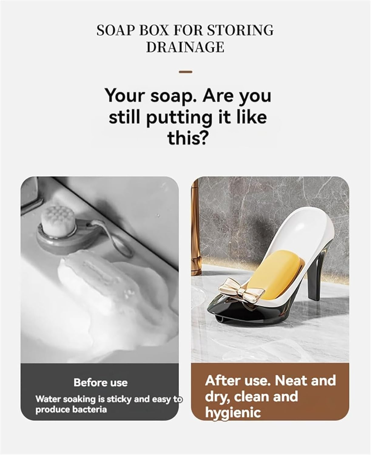 【Creative High Heels Design】: Our Creative High Heels Soap Box features a unique 45-degree inclined High Heels shape design, allowing for quick drying and efficient draining. No more water accumulation and mushy soap, ensuring your soap stays fresh and dry for longer.